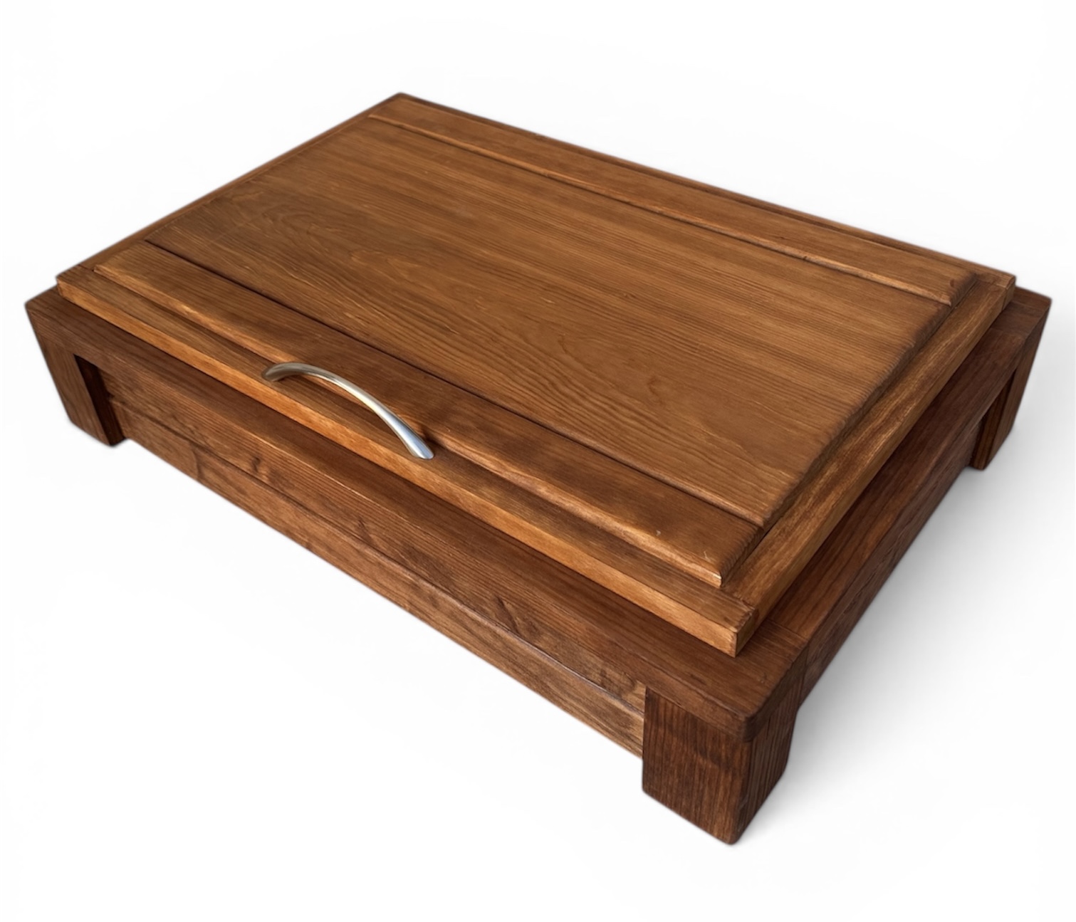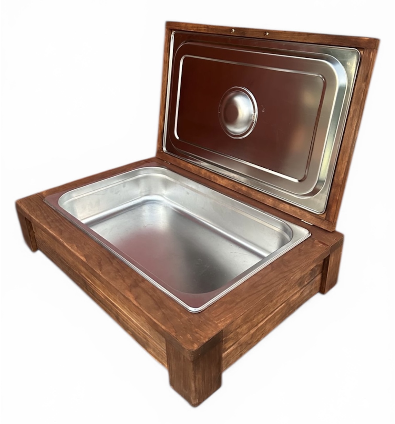 Fabricada en madera sólida de pino y equipada con insertos de acero inoxidable grado alimenticio, esta pieza combina resistencia, elegancia y funcionalidad en un solo producto.