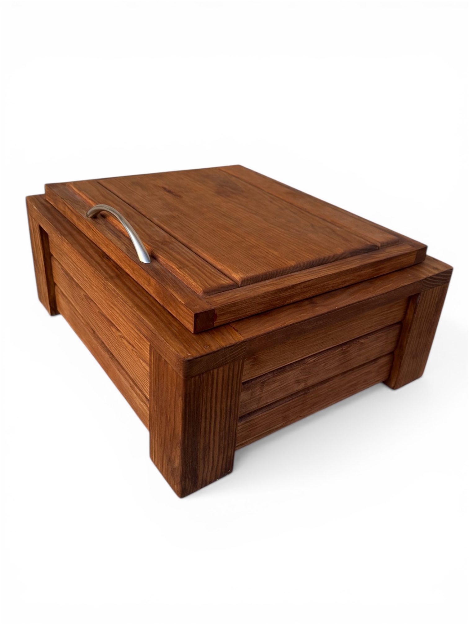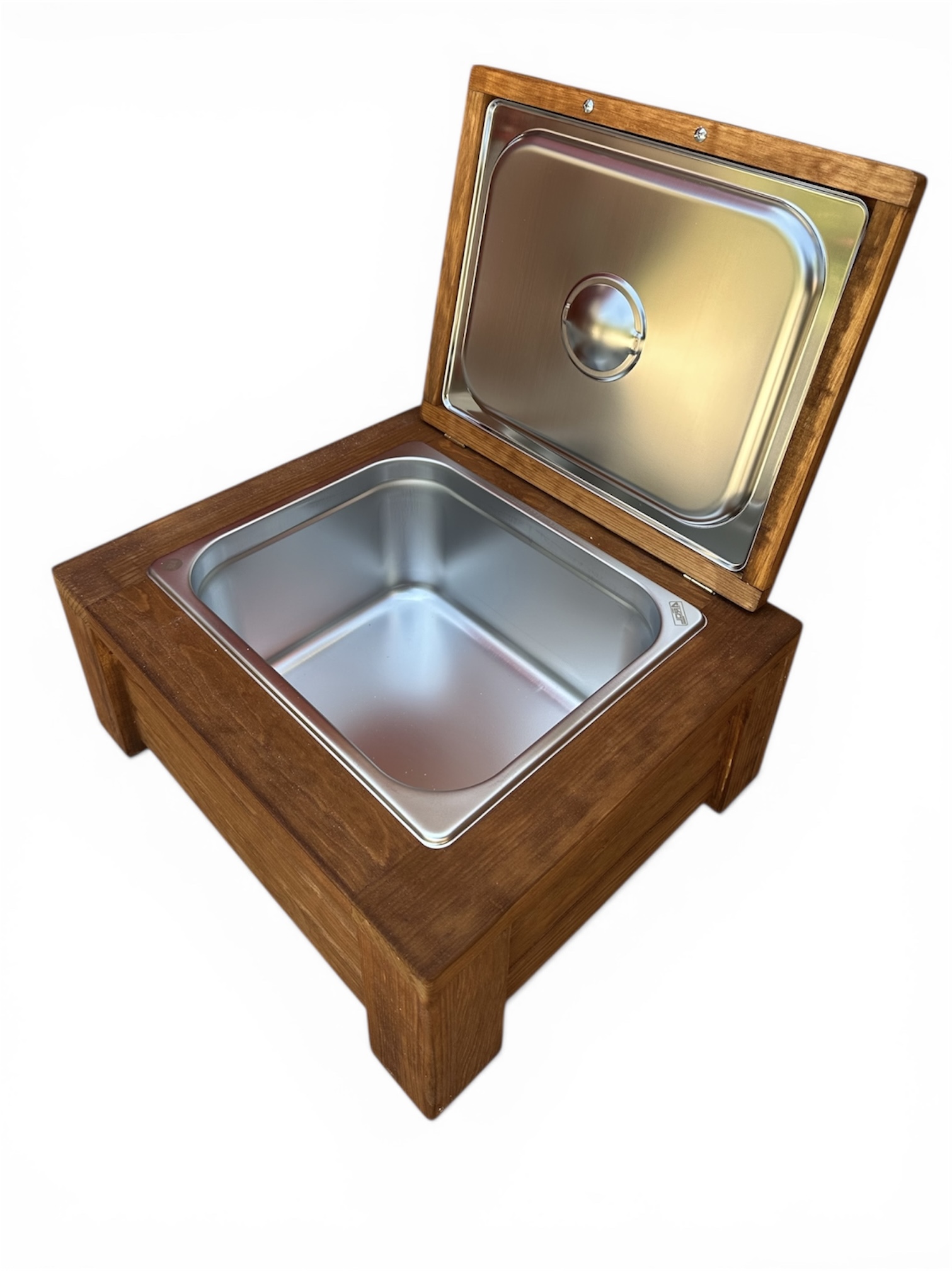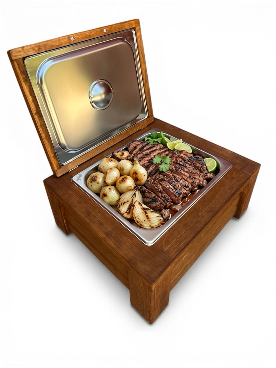 Fabricada en madera sólida de pino y equipada con insertos de acero inoxidable grado alimenticio, esta pieza combina resistencia, elegancia y funcionalidad en un solo producto.